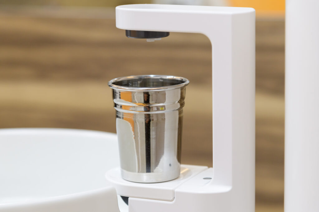 当院では、SDGsへの配慮と衛生面の両立を大切にし、うがい用のコップに紙コップではなくステンレス製のコップを採用しております。