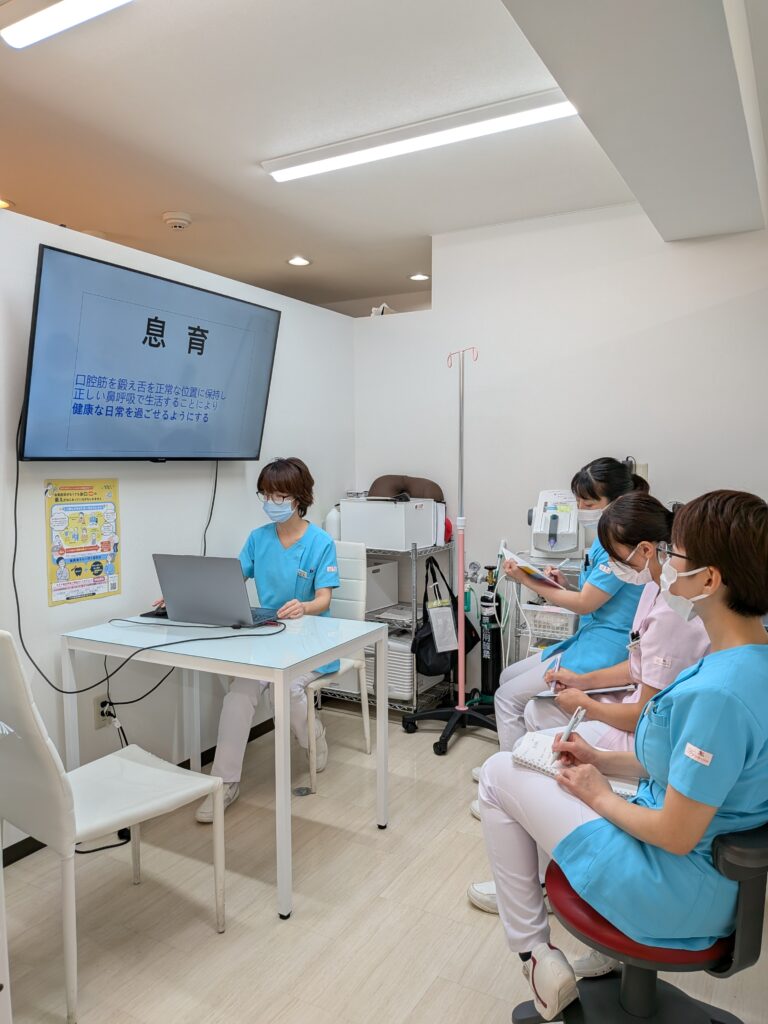 先日、当院の歯科衛生士が【あいうべ体操・息育指導士】の資格を取得し、スタッフ向けに院内セミナーを開催しました。